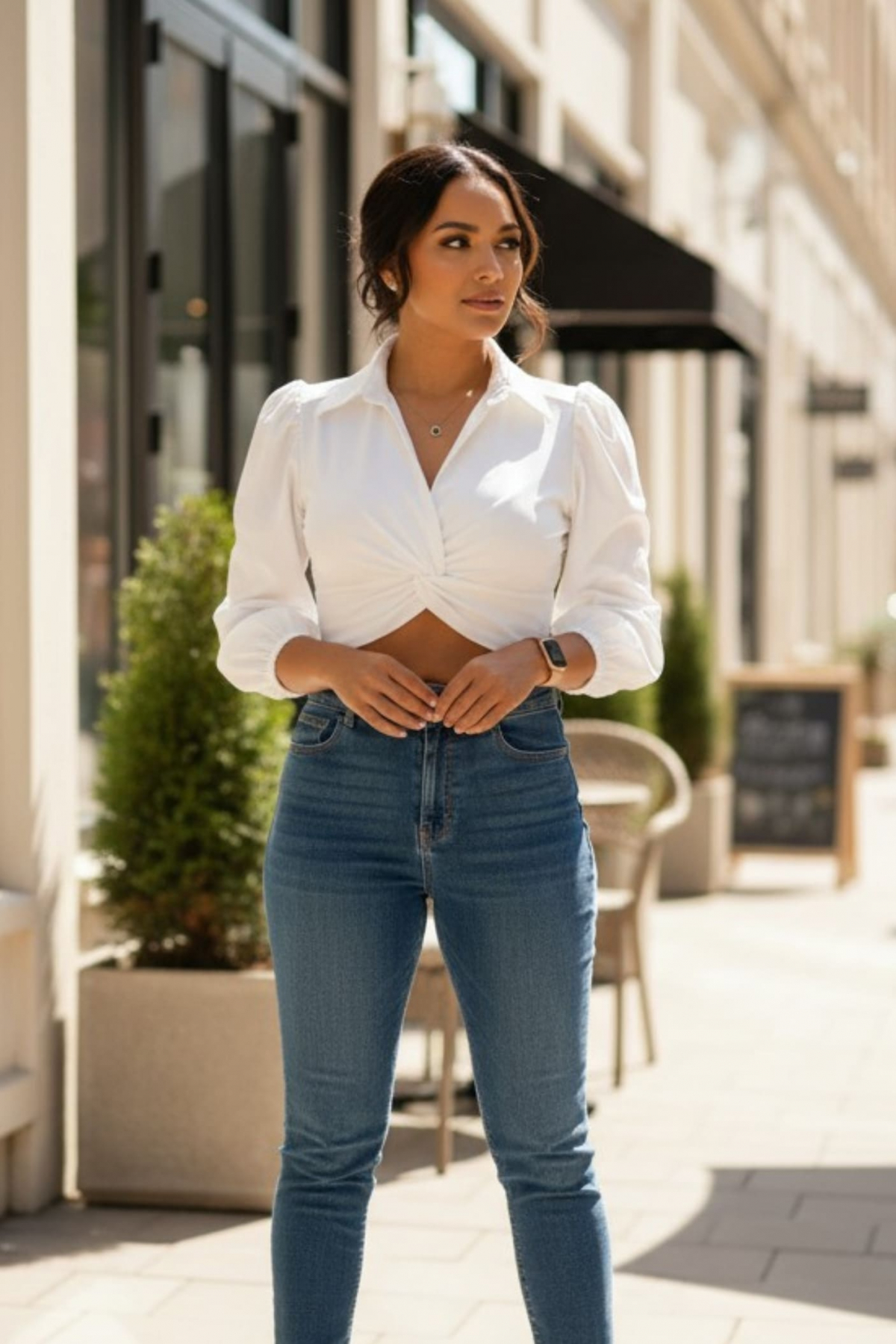 Esta blusa no necesita presentación: entra a la habitación y se hace notar. Su diseño cruzado con nudo frontal enmarca la cintura y crea una silueta impactante, mientras que la manga 3/4 abullonada y el cuello clásico le suman elegancia y fuerza. Es la prenda ideal para elevar un jean o combinar con una falda de tiro alto. Un básico elevado, para mujeres que saben que el poder también se viste.